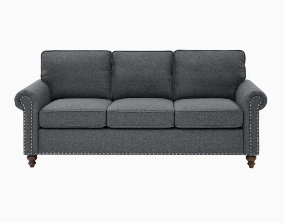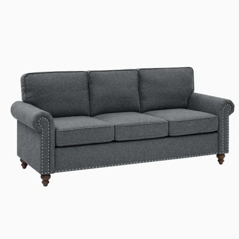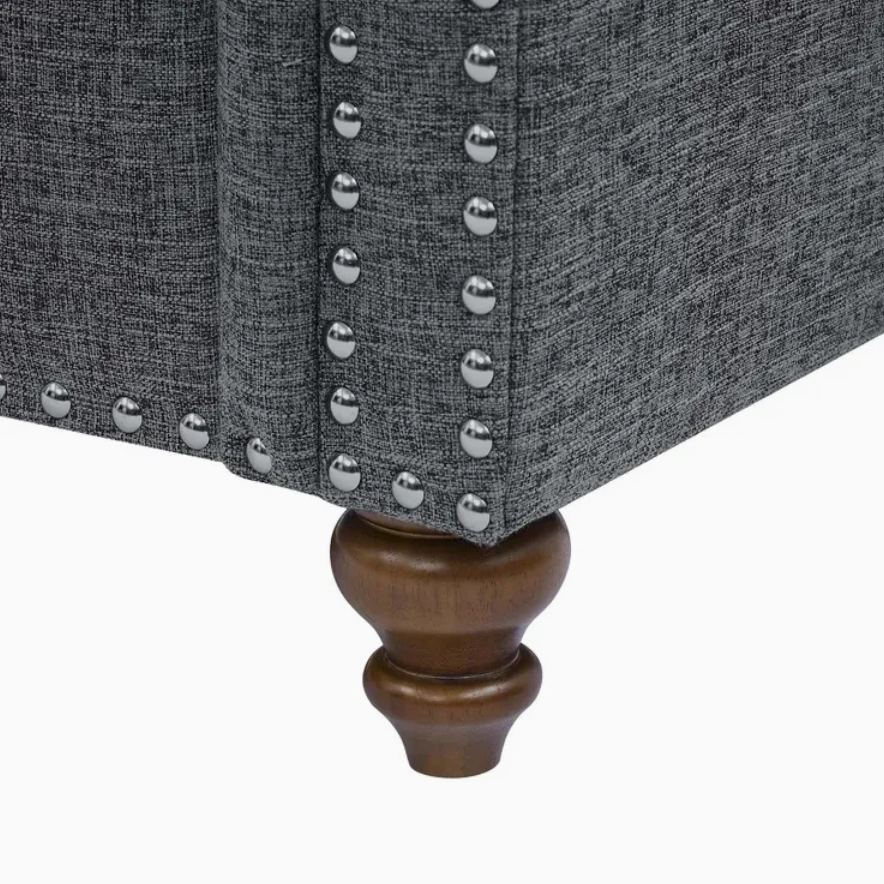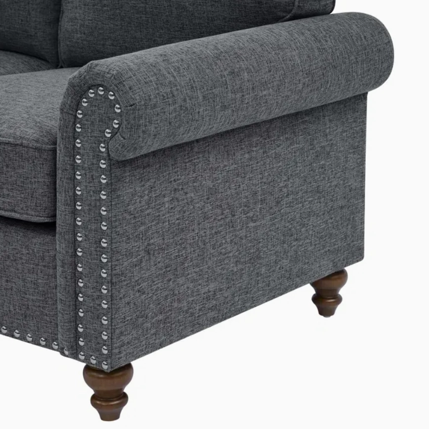 Eleve el ambiente de su hotel con nuestro sofá personalizado meticulosamente elaborado, diseñado para fusionar la estética atemporal con un comodidad excepcional. El sofá muestra una sofisticada tapicería gris, que exude de lujo discreto adecuado para varios temas de hotel, desde salones clásicos hasta suites modernas. Los delicados adornos de cabeza de uñas adornan los reposabrazos y la base, agregando un toque refinado, mientras que los reposabrazos curvos y las piernas de madera infunden encanto vintage, creando un punto focal que cautiva a los invitados.